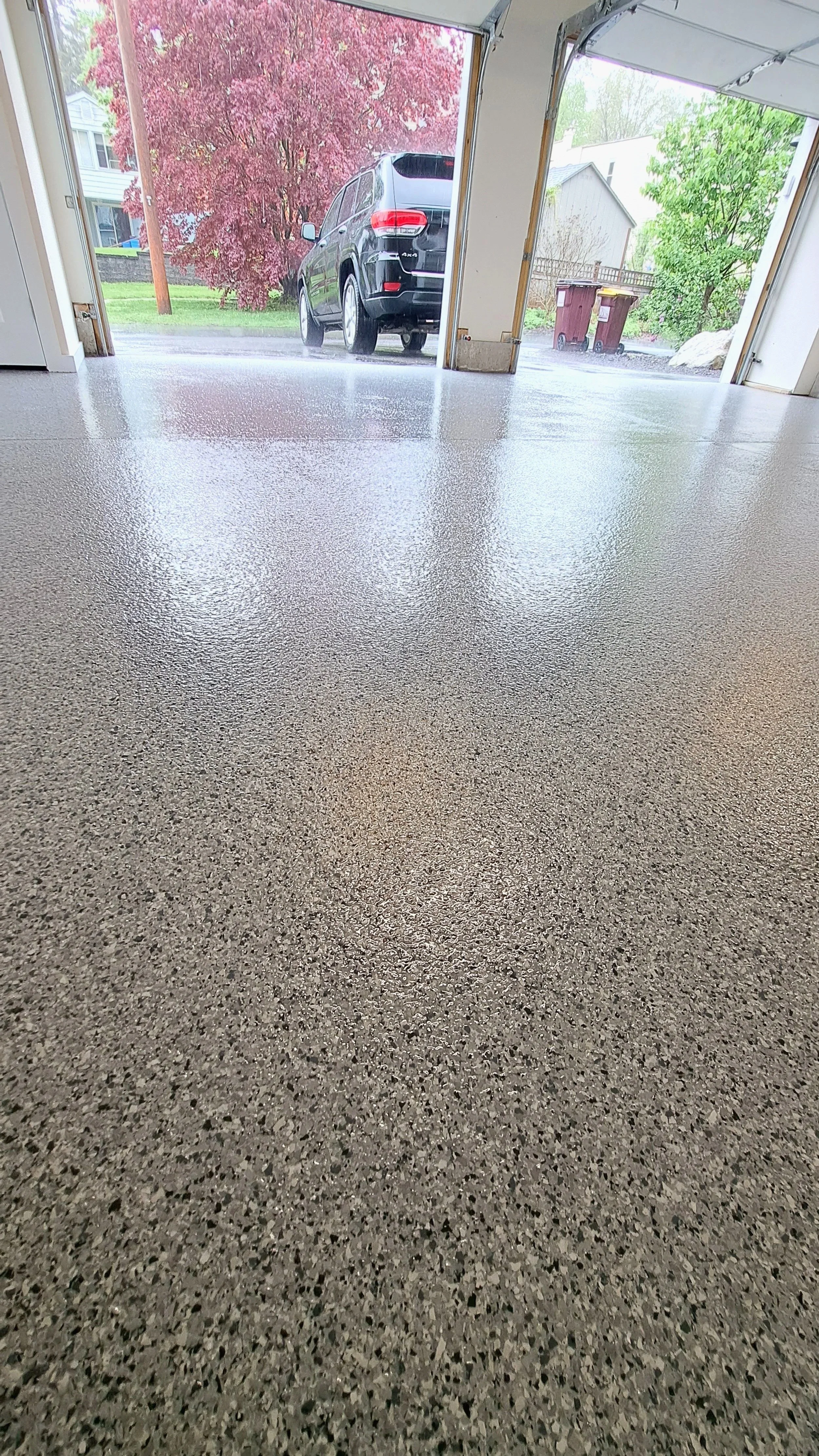 At Then & There Services, we specialize in transforming garage floors into durable, eye-catching spaces you'll love. Our hybrid epoxy system uses a tough epoxy base coat for strong adhesion, colorful vinyl flakes for style and grip, and a premium polyaspartic top coat that resists chemicals, impact, and wear.
